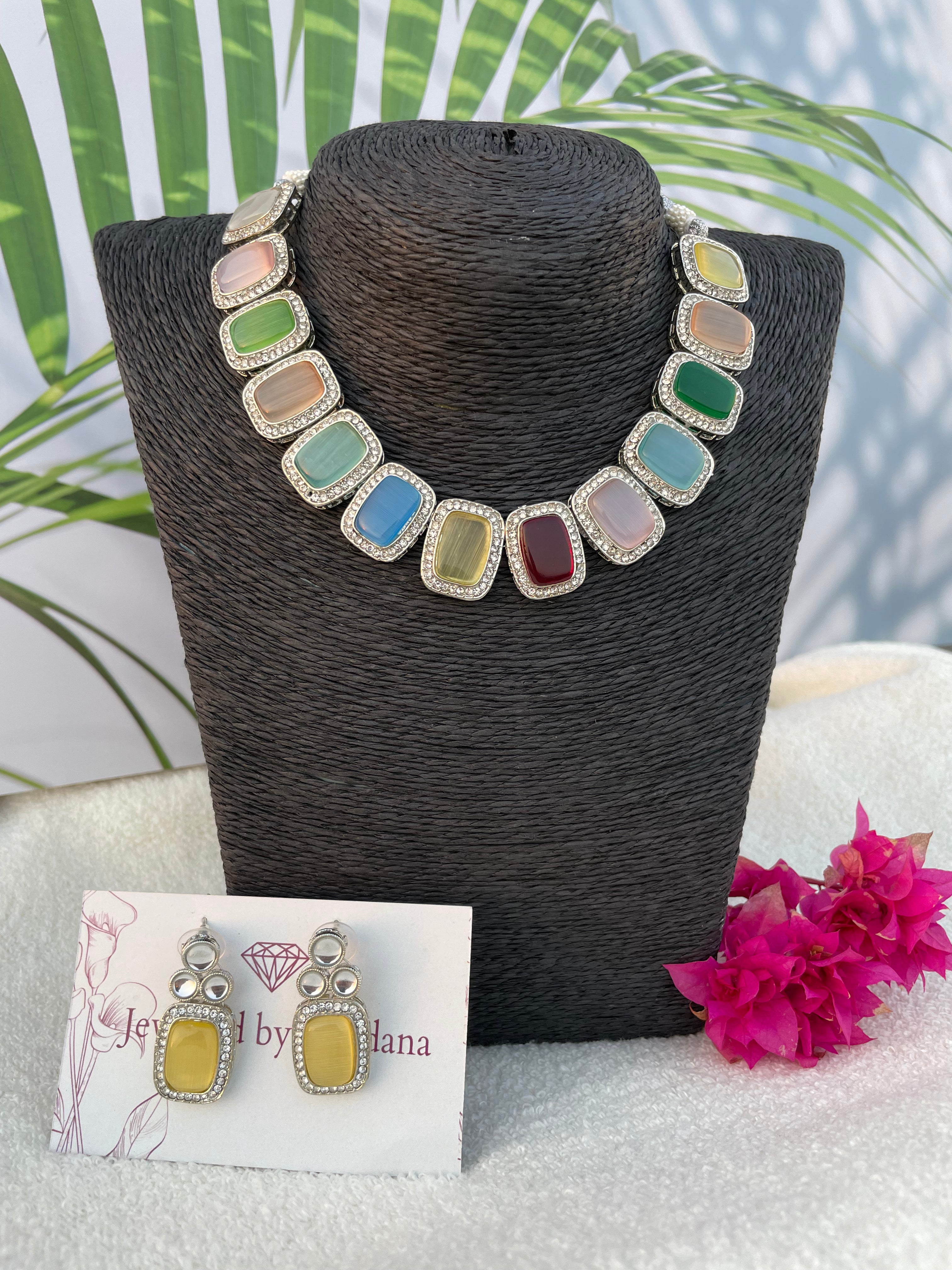 Bollywood inspired multicolored necklace set is made from brass and has a silver plated look to look elegant with any indian attire. A geometric designed earrings and maang tika add a difference to the look.